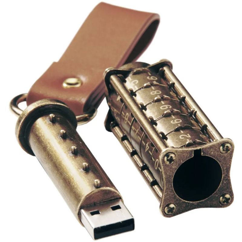 Dotée d’un mécanisme de verrouillage à combinaison, la clé USB cryptée Steampunk garantit que seul le détenteur du code secret pourra accéder à son contenu. Ce subtil mélange de design rétro et de technologie avancée reflète parfaitement l’esprit Steampunk, où chaque détail est pensé pour offrir une expérience utilisateur incomparable.
