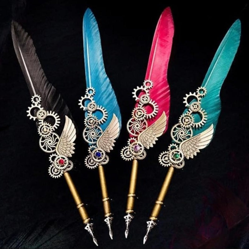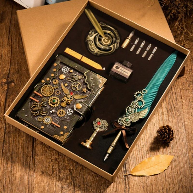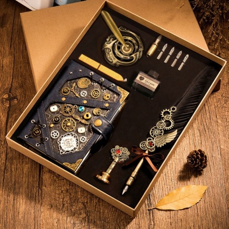 Doté d’un assortiment exceptionnel d’instruments d’écriture, le Coffret Steampunk comprend un carnet magnifiquement décoré avec des motifs de rouages. Offrant un éventail d’options pour transporter vos mots, il inclut également des porte-plumes délicatement conçus ainsi qu’une bouteille d’encre personnalisable. Chaque élément est pensé pour s’intégrer parfaitement à l’esthétique steampunk, ajoutant une dimension narrative à vos récits personnels.