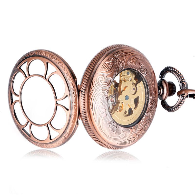 Le boîtier rosacé de la Montre à Gousset Or Rose, doté d’un cadran à chiffres romains, révèle toute la beauté des mécanismes internes. Cet élément design, tout en transparence, permet aux passionnés d’horlogerie d’admirer le mouvement complexe et captivant de la montre.