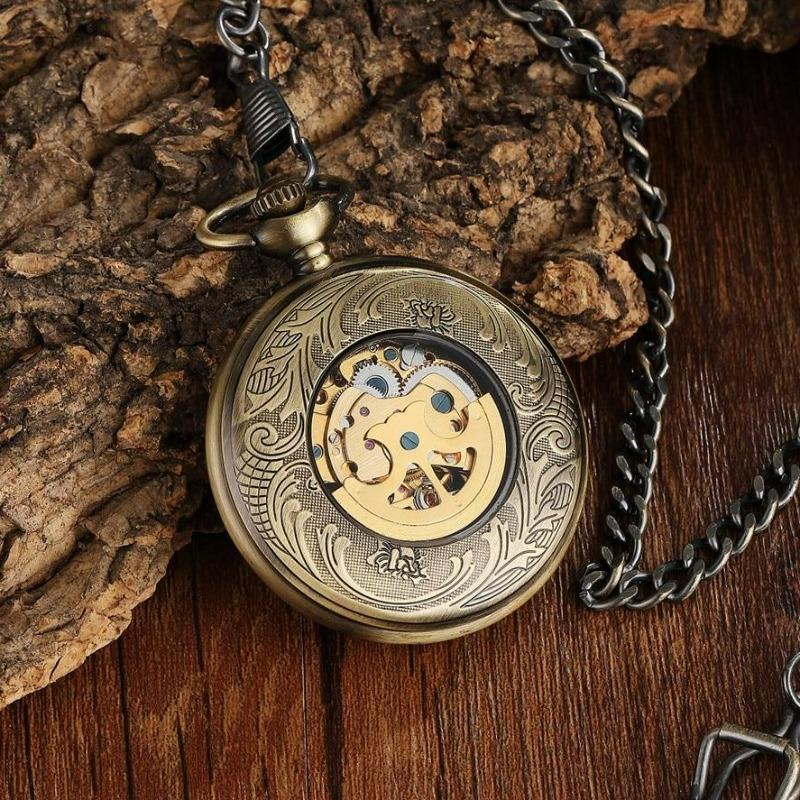 Le cadran de la Montre à Gousset Steampunk Soleil offre une vue imprenable sur son mécanisme interne grâce à un boîtier demi-chasseur. Cette caractéristique immortalise la beauté mécanique sous la lumière radieuse du soleil. La complexité de ses rouages et la précision de son mouvement vous captivent à chaque instant.