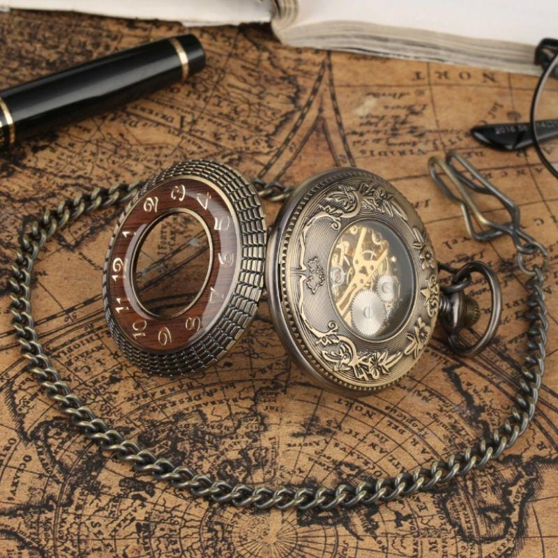 Chaque montre de poche vintage Steampunk révèle un design soigneusement conçu pour capturer l’essence du genre. Le boîtier à clapet hublot ajoute une sophistication supplémentaire, tandis que l’effet bois du cadran rappelle les anciennes machines à vapeur et leurs rouages complexes.