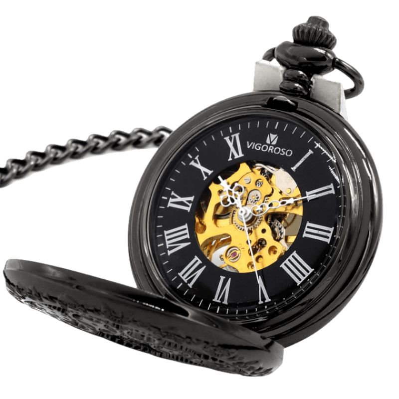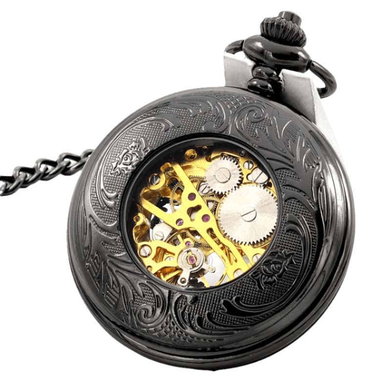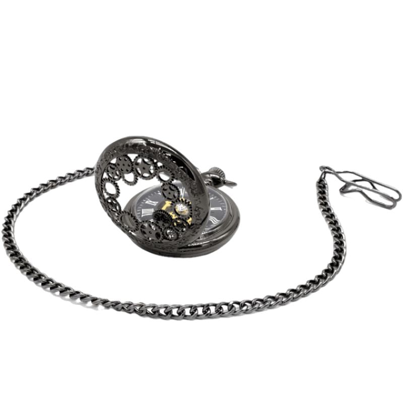 Plongez dans l’esthétique audacieuse de la Montre Gousset Rouages, avec son design qui réunit la robustesse du métal et la beauté complexe des engrenages apparents. Ce garde-temps s’affiche comme un symbole audacieux de votre goût pour l’intrigue et l’ingénierie. La teinte noire et le mouvement mécanique soulignent l’importance de la machine dans l’art Steampunk.