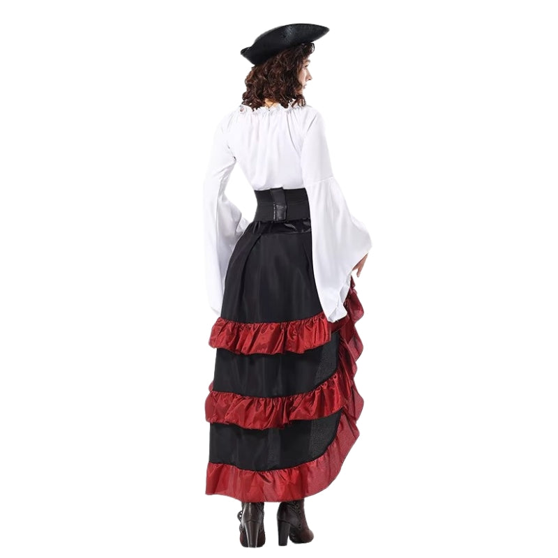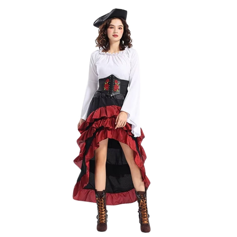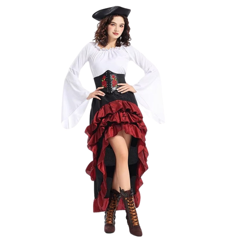 - Accessoires inclus: Corset, chemisier, jupe, chapeau